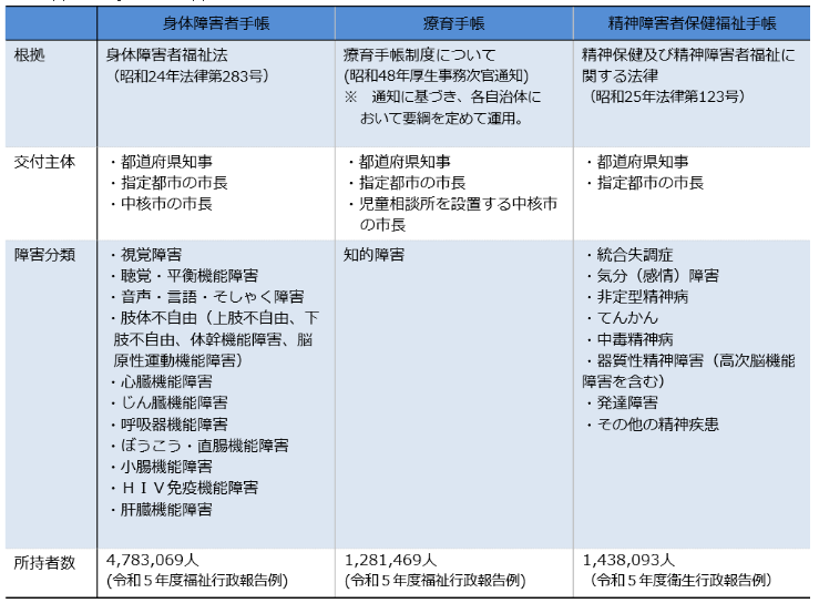 現行の法律では、一口に「障害者」を定義したものはなく、「身体障害」「知的障害」「精神障害」について、それぞれ「身体障害者福祉法」「知的障害者福祉法」「精神保健福祉法」で、規定しています。